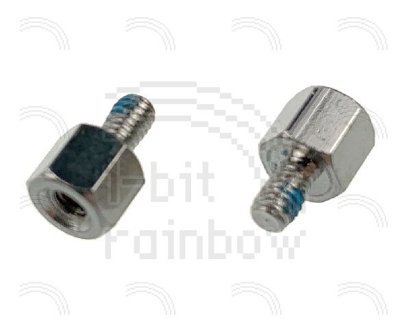 Original Apple 5.5mm/8.5mm stiffener standoff for all the iBook G3 Clamshell ranges. This screws through the logic board at position ZH1 and supports the centre left of the stiffener. 5.5mm is the standoff height when fitted, 8.5mm is the overall height including the threaded portion. The hex width is 5mm.
