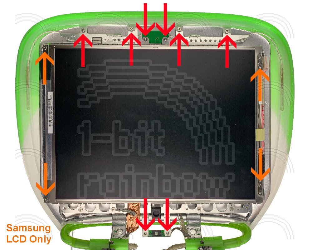 4 x original Apple Philips 3.6mm internal display screws for all the iBook G3 Clamshell ranges. Four secure the LCD panel (Samsung LCD only), four secure the top of the display chassis, three secure the inverter board, and two secure each of the antenna board and sleep light board.