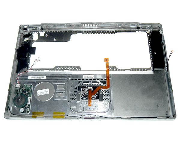 Complete top case for 667MHz (DVI), 800MHz, 867MHz & 1GHz models of Titanium PowerBook G4. This unit icludes the power button, speakers, trackpad, trackpad button, trackpad flex cable, AirPort antenna and PMU board.