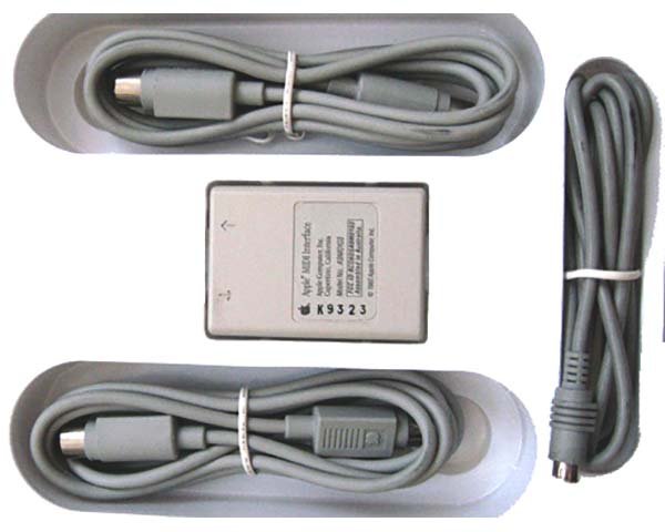 Original Apple MIDI Interface for Macintosh models with 9-pin serial ports as well as the Apple IIGS. The kit comes with three original Apple branded cables; one serial cable to connect the interface to the Mac, and two MIDI cables to connect to MIDI musical instruments.