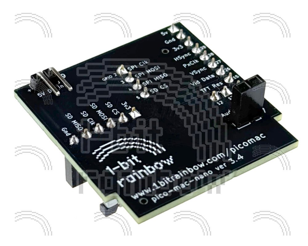 Custom designed printed circuit board version 3.4 (functionally identical to v3.2) for the 1-bit rainbow pico-mac-nano implementation of the open source pico-mac project. This is a fully assembled version with all components are pre-soldered (surface mount components and headers. This board fits within the 62mm high replica Macintosh case and connects the Pico Zero, SPI micro-SD card module, and 2" TFT LCD panel together. It includes all surface mount components (pre-soldered), header sockets and connections for planned audio and battery modules. The only difference between v3.2 and v3.4 is that we ordered v3.4 with the headers pro-soldered so the PCB itself is identical to v3.2.